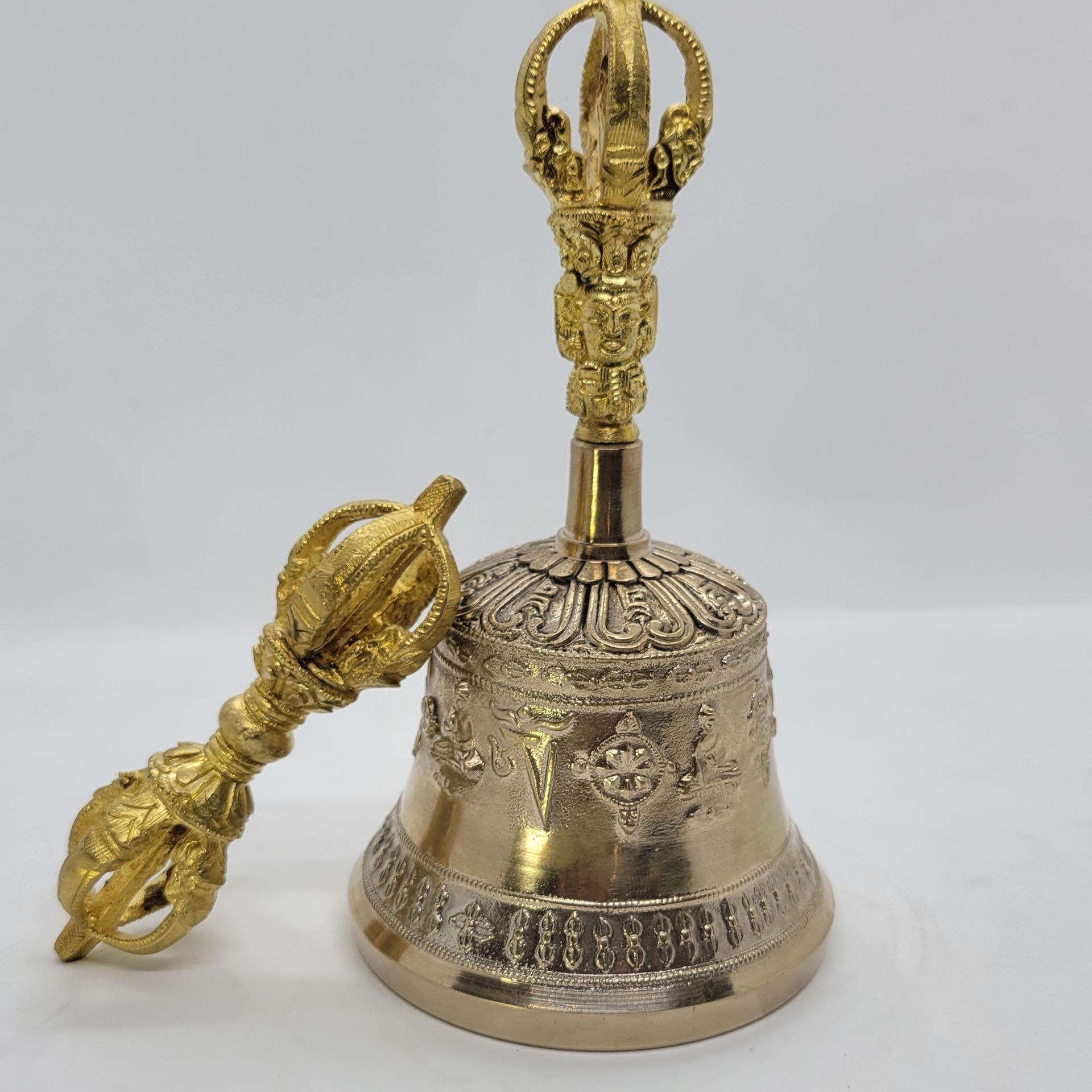 Handmade from aged brass, this ritual duo symbolizes wisdom (bell) and compassion (dorje). Intricate hand-engraved motifs reflect Tibetan Buddhist traditions. Ideal for meditation altars or sacred decor. Crafted by Himalayan artisans.
