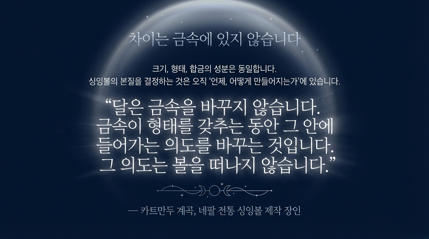 저희 보름달과 초승달 볼은 단순히 달의 이름을 붙인 것이 아닙니다. 이 전통을 수 세대에 걸쳐 지켜온 카트만두 계곡의 장인 가문이 실제로 해당 달 위상에 맞춰 제작합니다.