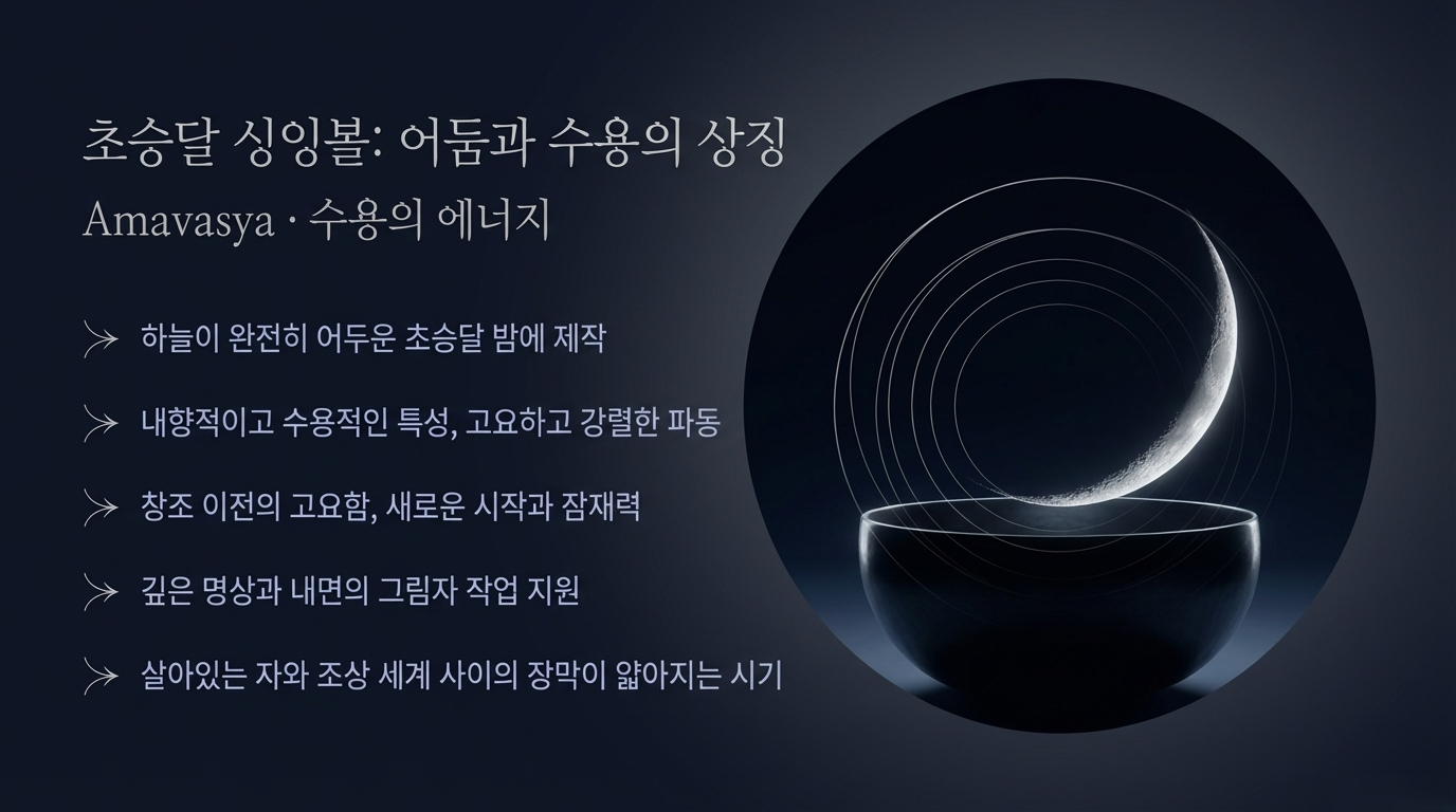 🌑 초승달 (삭망) 아마바샤. 어둠과 고요, 내면 집중. 의도 설정과 깊은 내면 작업의 시간.