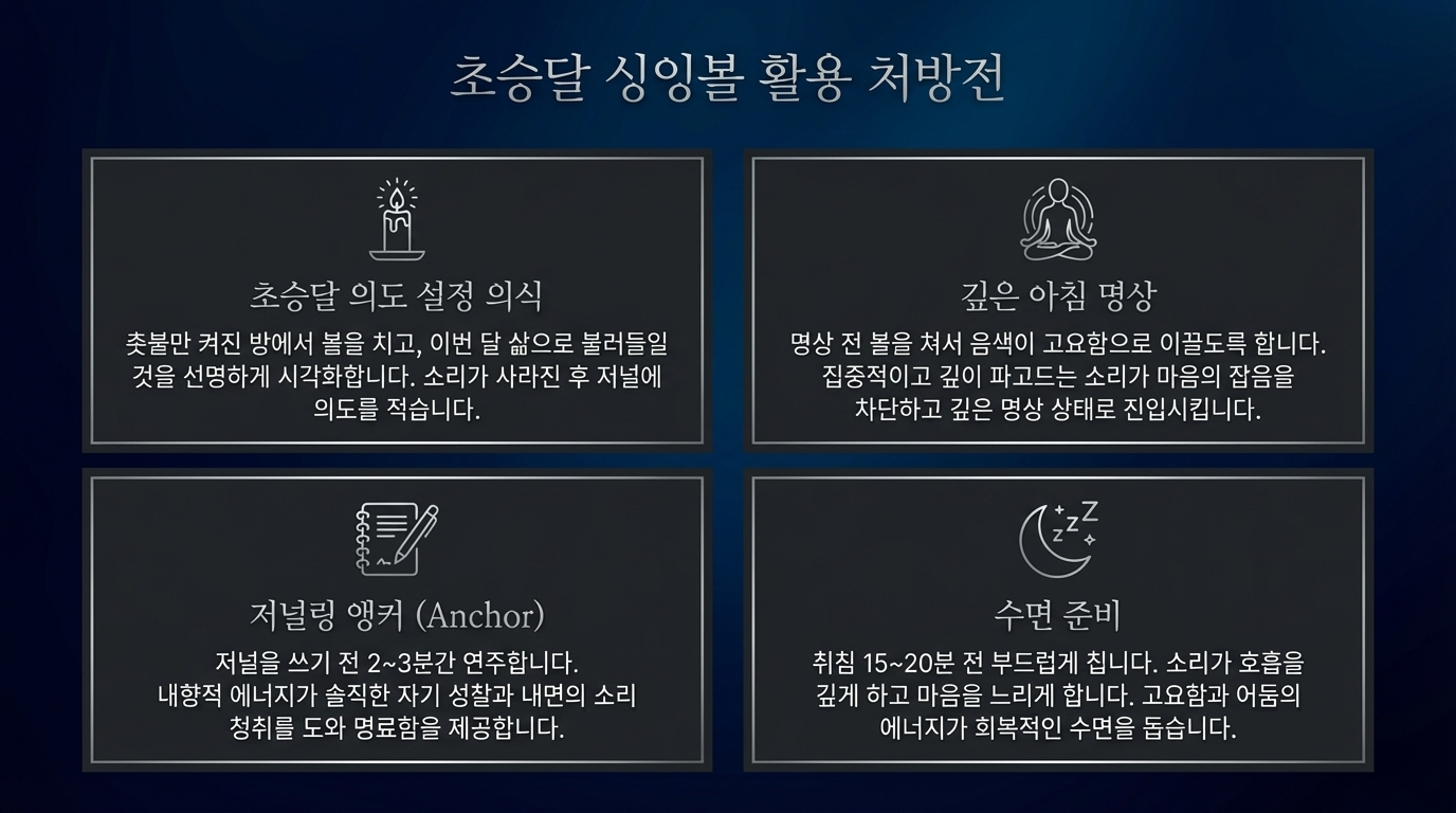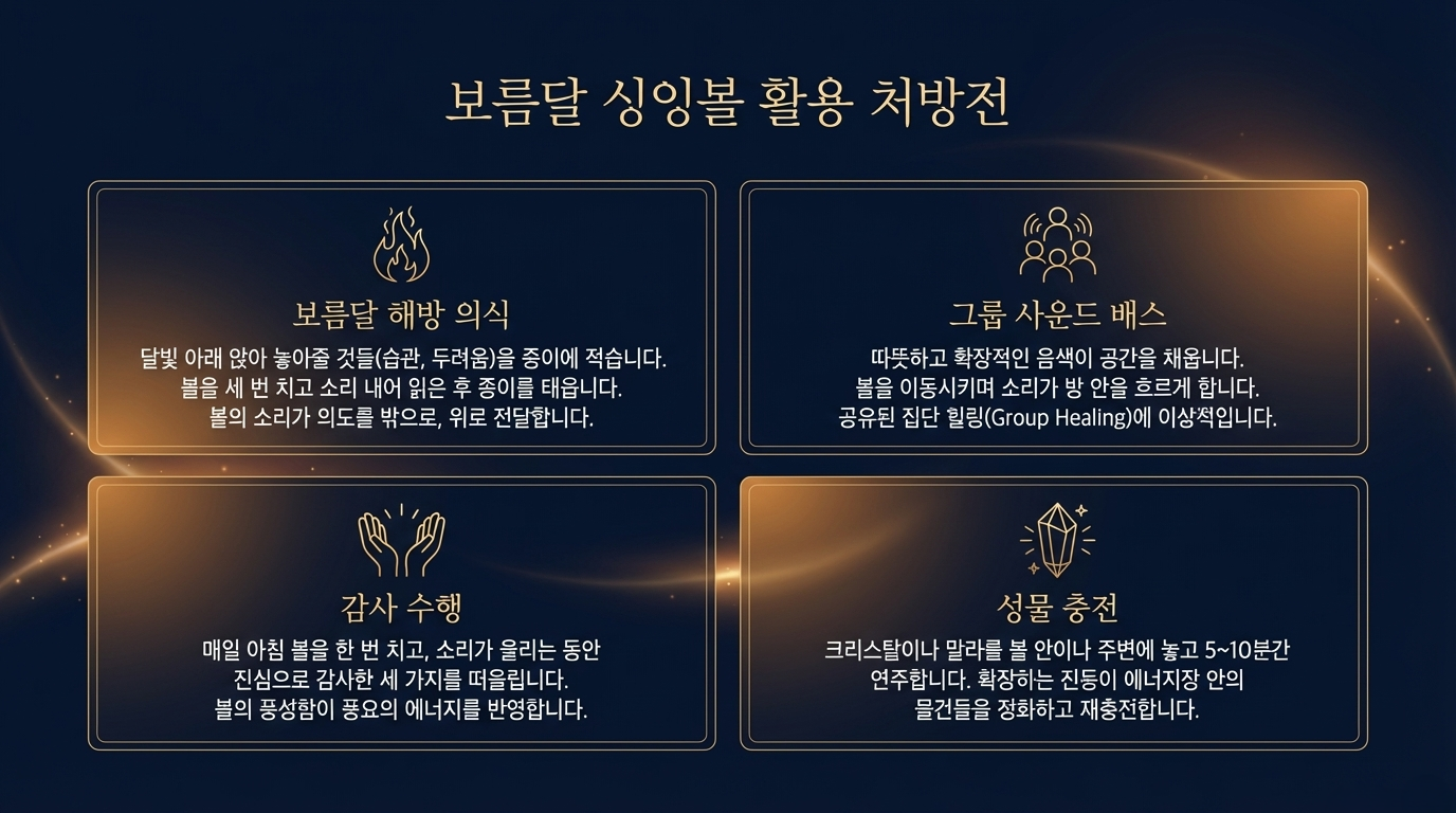 보름달 밤, 달빛을 볼 수 있는 창가나 야외에 앉습니다. 종이에 내려놓을 준비가 된 것들 — 습관, 두려움, 오래된 이야기들 — 을 적습니다. 볼을 세 번 치고, 목록을 소리 내어 읽은 후 종이를 태우거나 찢습니다. 볼의 소리가 당신의 의도를 밖으로, 위로 전달한다고 믿어집니다.