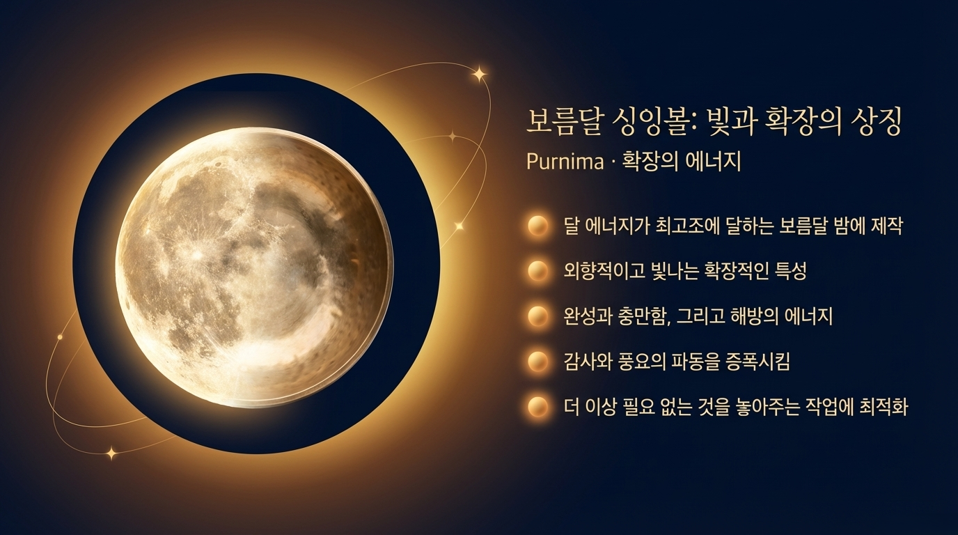 🌕 보름달 (망월) 푸르니마. 최고조의 에너지, 밝음, 완성. 축하와 해방의 시간.