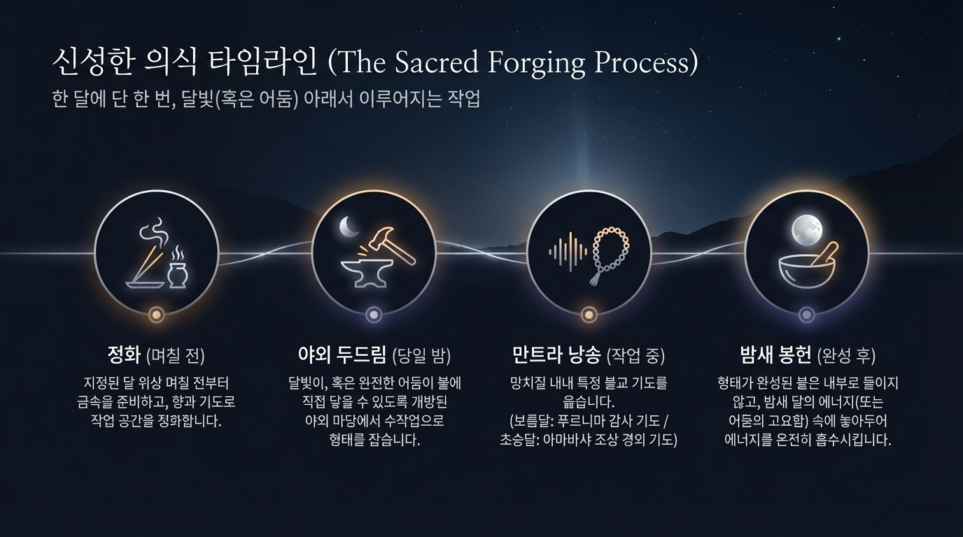 과정은 지정된 달 위상 며칠 전부터 시작됩니다 — 금속을 준비하고 작업 공간을 향과 기도로 정화합니다. 당일 밤, 장인들은 달빛이 — 혹은 그 부재가 — 형태를 갖추는 볼에 닿을 수 있는 야외 또는 개방된 작업장에서 작업합니다.
