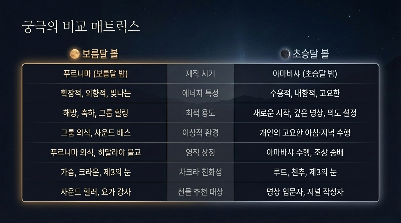 • 두 개 모두 소유하기: 많은 진지한 수행자들이 초승달 볼은 일상적인 개인 수행에, 보름달 볼은 그룹 작업이나 의식적 사용에 씁니다. 함께 사용하면 달의 에너지와 힐링 에너지의 전체 스펙트럼을 커버합니다.