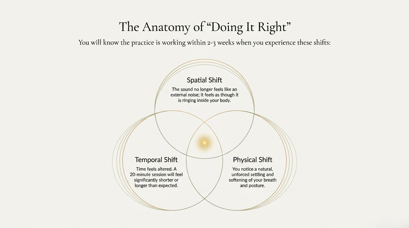 You will know the session is working when you notice: the sound feels like it is inside the body rather than outside it, time feels different (shorter or longer than expected), and there is a natural settling or softening of breath and posture. These signs appear reliably within 2–3 weeks of daily practice.