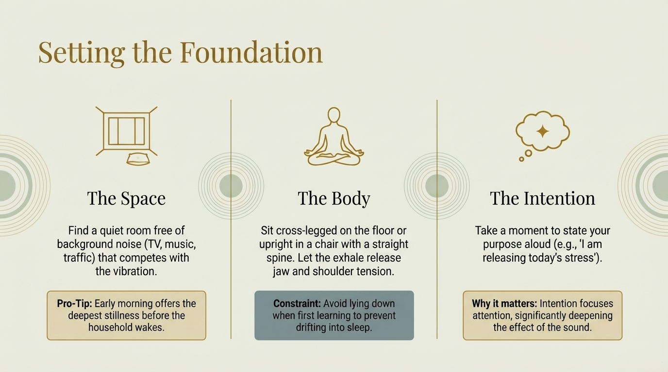 Before playing, take a moment to decide why you are sitting. It does not need to be elaborate — "I want to feel calmer" or "I am releasing today's stress" is enough. Intention focuses your attention, which significantly deepens the effect of the sound. Many practitioners simply say their intention aloud once before they begin.