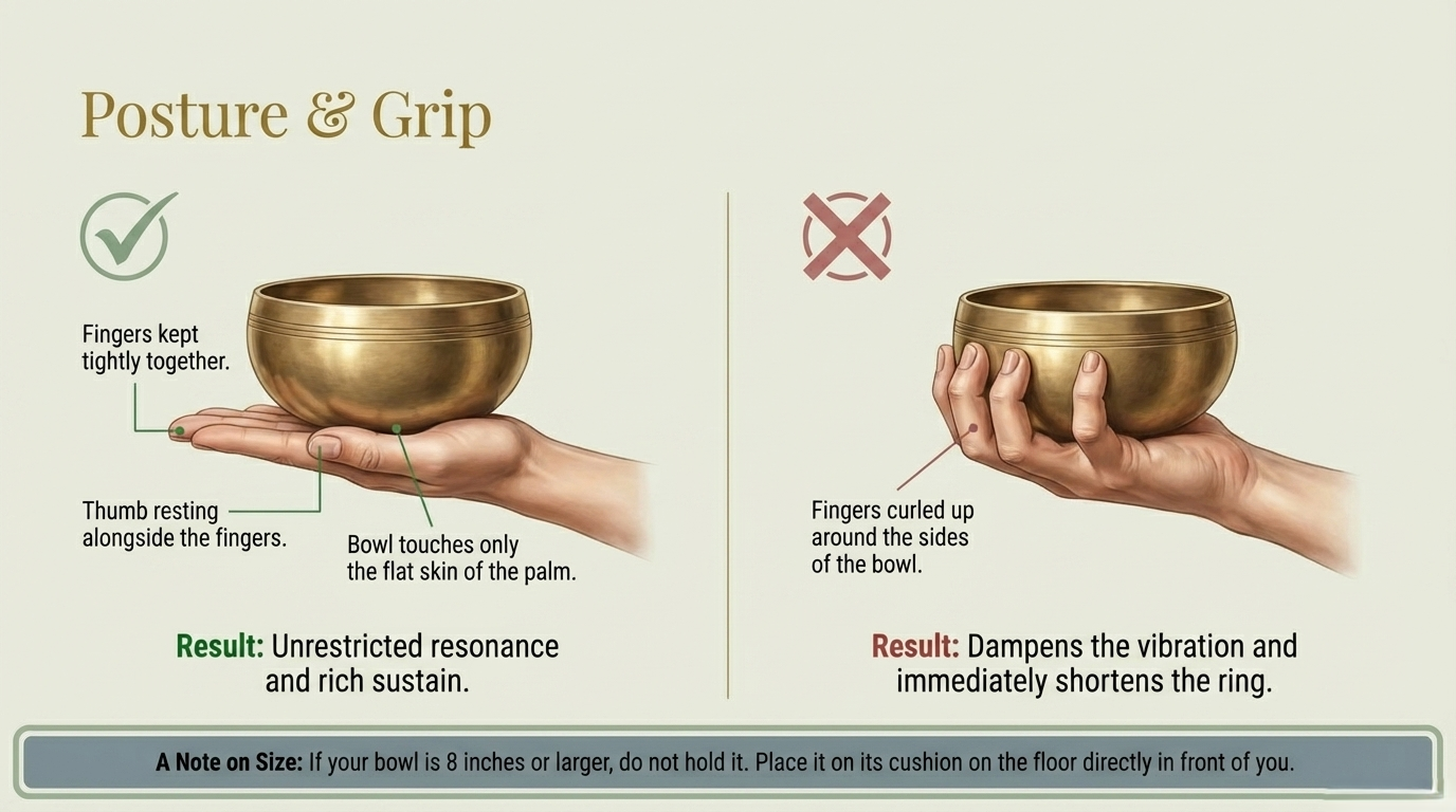 Rest the bowl on your open, flat palm — fingers together, thumb resting alongside them. Do not grip the bowl or curl your fingers up around the sides. Any contact between your fingers and the bowl's body will dampen the vibration and shorten the ring. If the bowl is large (8 inches or more), place it on its cushion on the floor in front of you rather than in your hand.