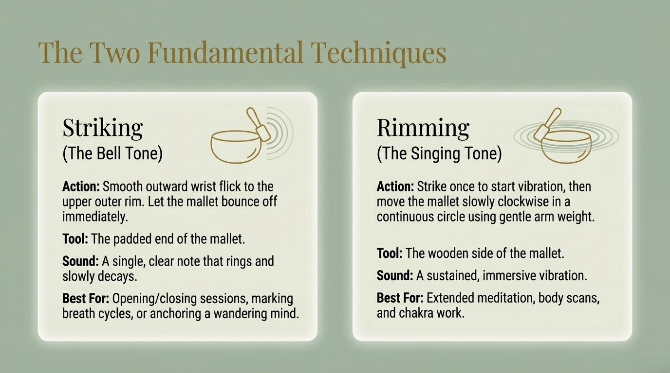 Rimming produces the sustained "singing" sound the bowl is named for. It takes more practice but creates the most immersive meditative experience.