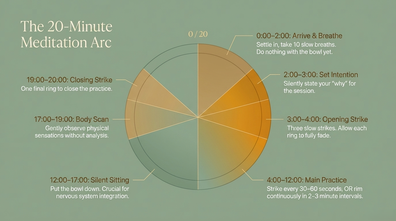 | 4:00 – 12:00 | Main meditation | Choose one approach: (A) Strike every 30–60 seconds and follow each ring into silence with your full attention. Or (B) Rim the bowl continuously for 2–3 minutes, then rest in silence for 2–3 minutes. Repeat. Follow whatever feels most natural. |