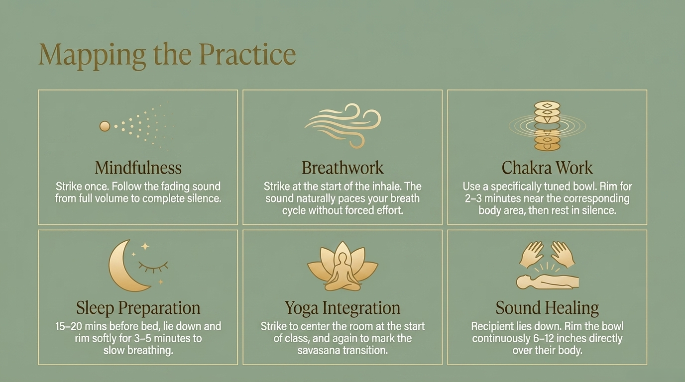 Strike at the start of each inhale. Let the ring be the length of your breath cycle. The sound gives the breath a rhythmic anchor that deepens the practice naturally.