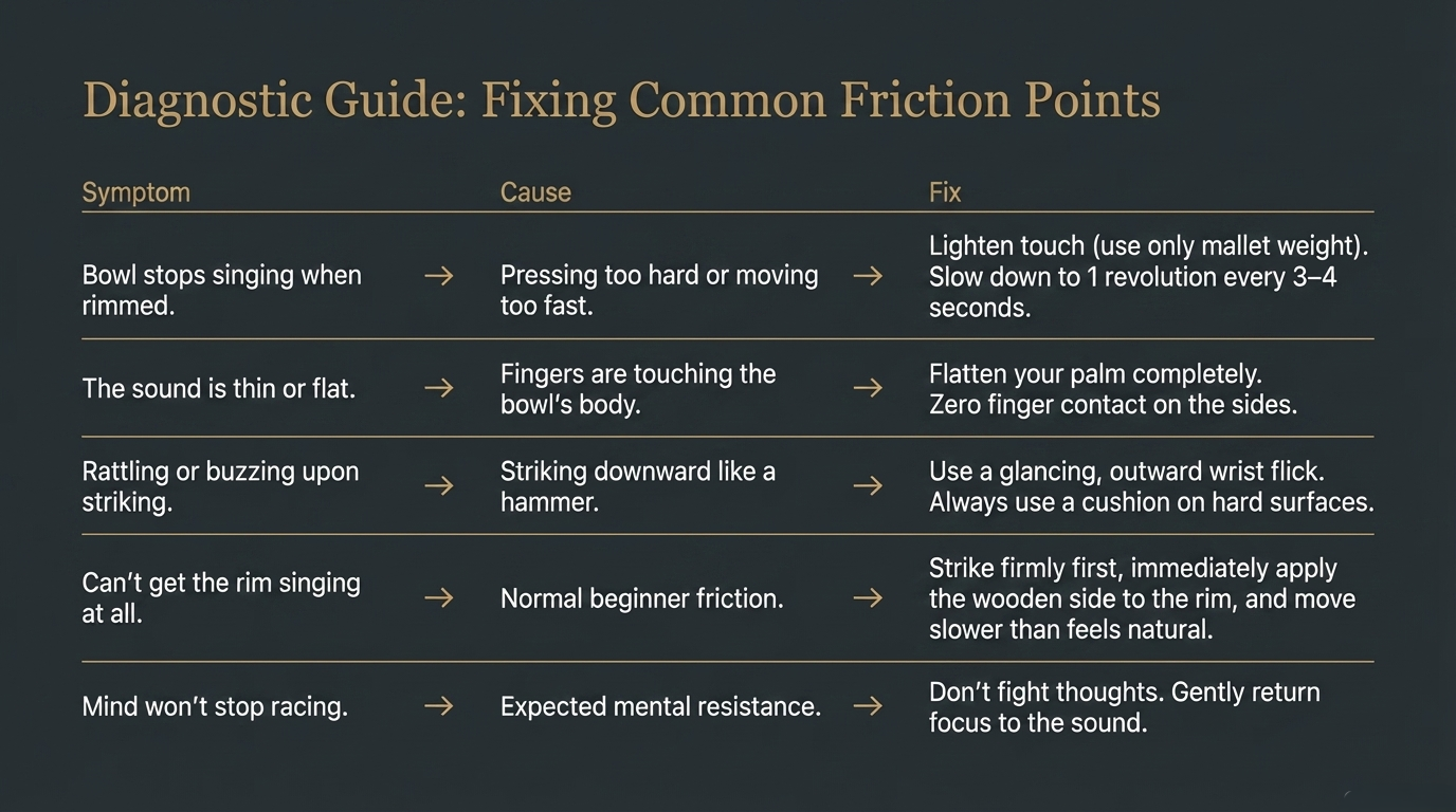 This is the most common beginner frustration, and it always resolves with patience. Start by striking the bowl firmly, then immediately place the wooden side of the mallet (not the padded end) against the rim. Move slowly — slower than feels natural. The sound will emerge within a few rotations once you find the right pressure and speed combination.