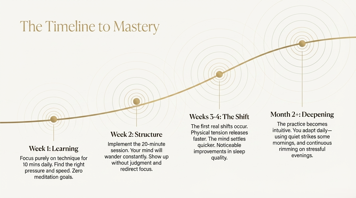 After 30 days of daily practice, you will find yourself naturally adapting the session to what you need each day. Some mornings call for five quiet strikes and silence. Some evenings call for twenty minutes of continuous rimming. The bowl becomes a genuine companion in practice — something you understand from the inside rather than simply follow instructions about.