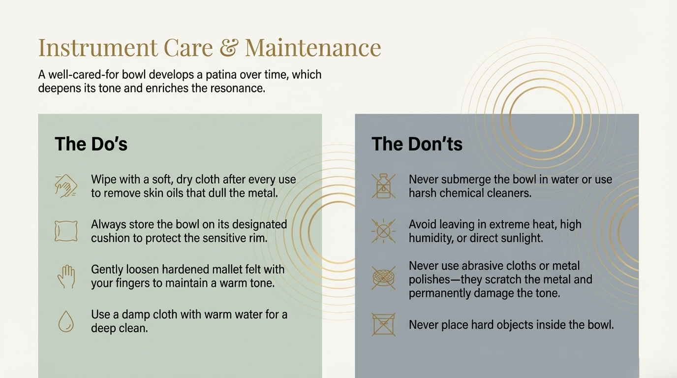 - What not to do: Never strike the bowl with anything other than its mallet. Never place hard objects inside the bowl. Never use abrasive cloths or metal polishes — they scratch and damage the tone.