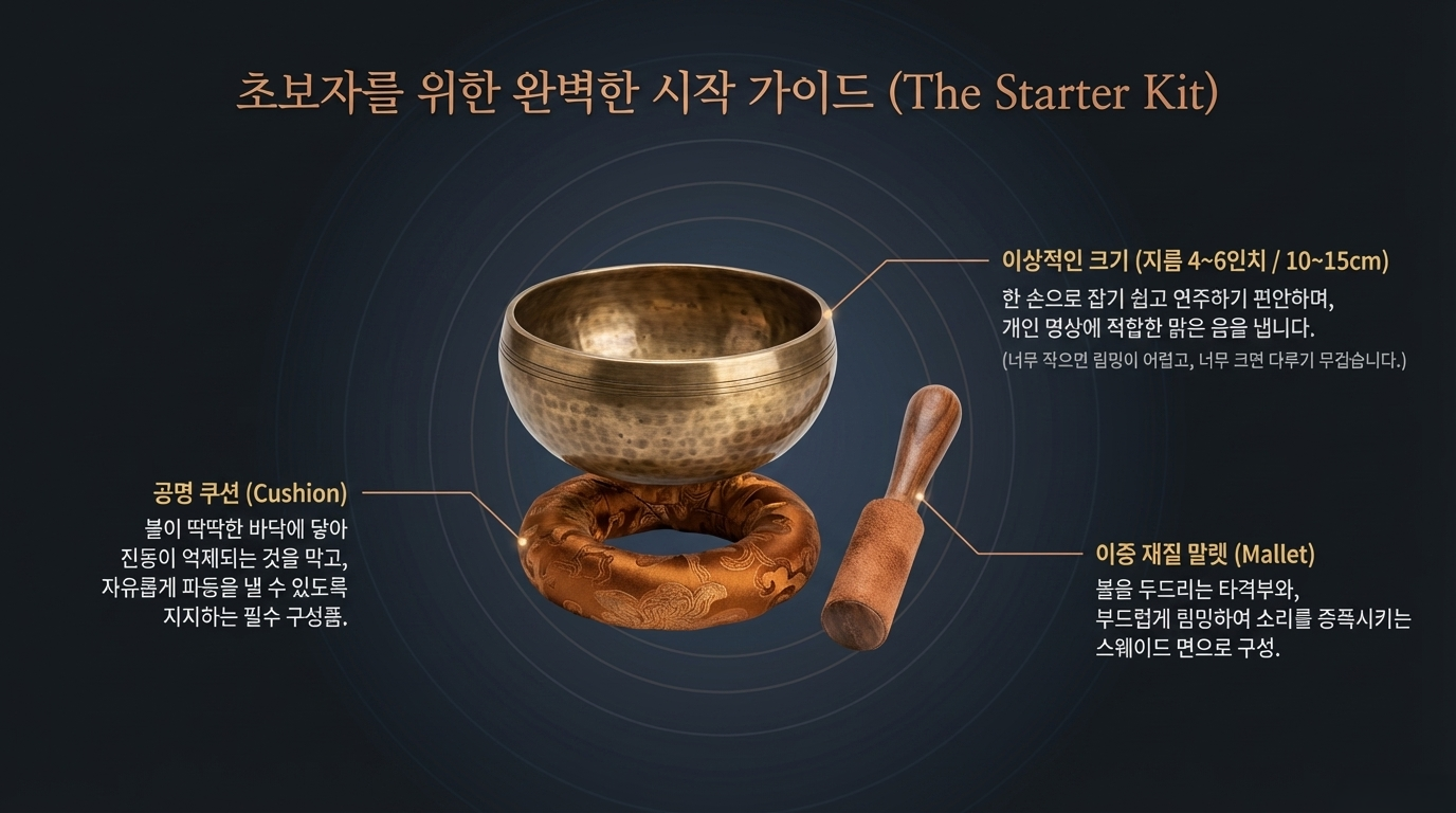초보자에게는 지름 4~6인치(약 10~15cm)의 중간 크기 볼이 이상적입니다. 이 크기는 잡기 쉽고, 연주하기 쉬우며, 개인 명상과 가정용으로 적합한 맑고 기분 좋은 음을 만들어냅니다. 작은 볼(3인치 이하)은 림밍이 더 어렵고 매우 높은 음을 냅니다. 큰 볼(8인치 이상)은 전문 사운드 힐링 수행자에게 더 적합합니다.