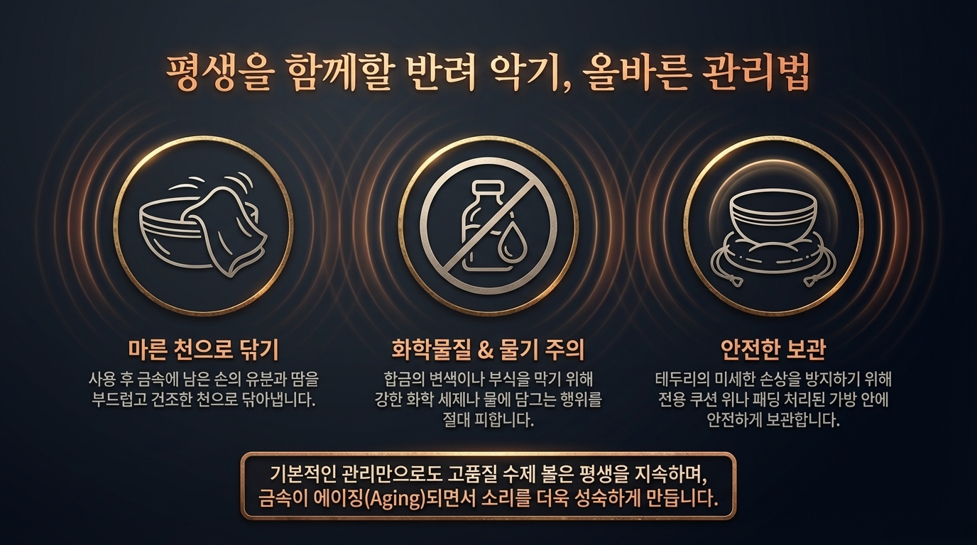 티베트 싱잉볼은 최소한의 관리만 필요합니다. 사용 후 손의 기름을 제거하기 위해 부드럽고 건조한 천으로 볼을 닦습니다. 강한 화학물질이나 물에 담그는 것을 피합니다. 테두리를 보호하기 위해 쿠션 위나 패딩된 가방에 보관합니다. 기본적인 관리만으로 고품질 수제 볼은 평생 지속되며 금속이 노화되면서 음이 더욱 깊어질 수도 있습니다.