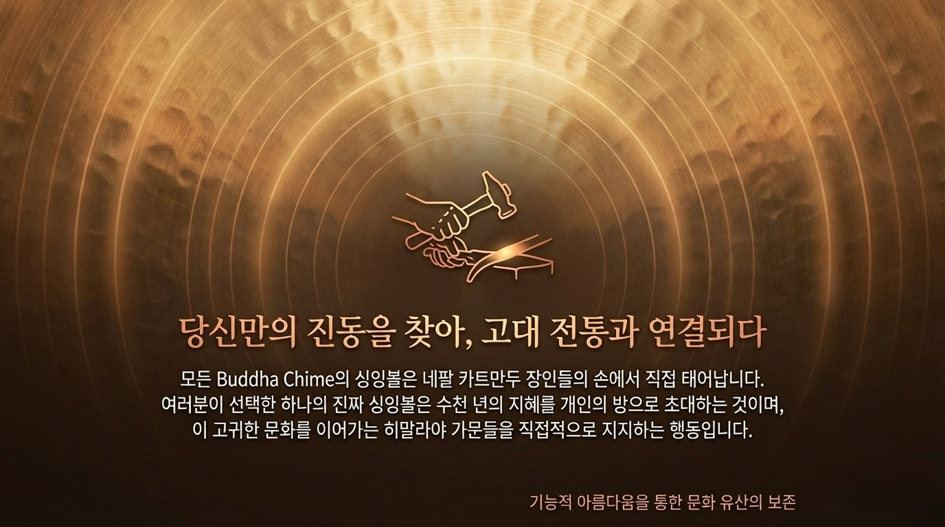 "티베트" 싱잉볼이라는 이름에도 불구하고, 가장 훌륭하고 정통적인 싱잉볼은 사실 네팔 — 특히 카트만두 계곡 — 에서 만들어집니다. 이곳에서는 숙련된 금속 장인 가문들이 천 년 이상 된 기법을 보존하며 그 기술을 대대로 전수하고 있습니다. Buddha Chime의 볼들은 바로 이 카트만두 장인들이 한 땀 한 땀 손으로 빚어냅니다.