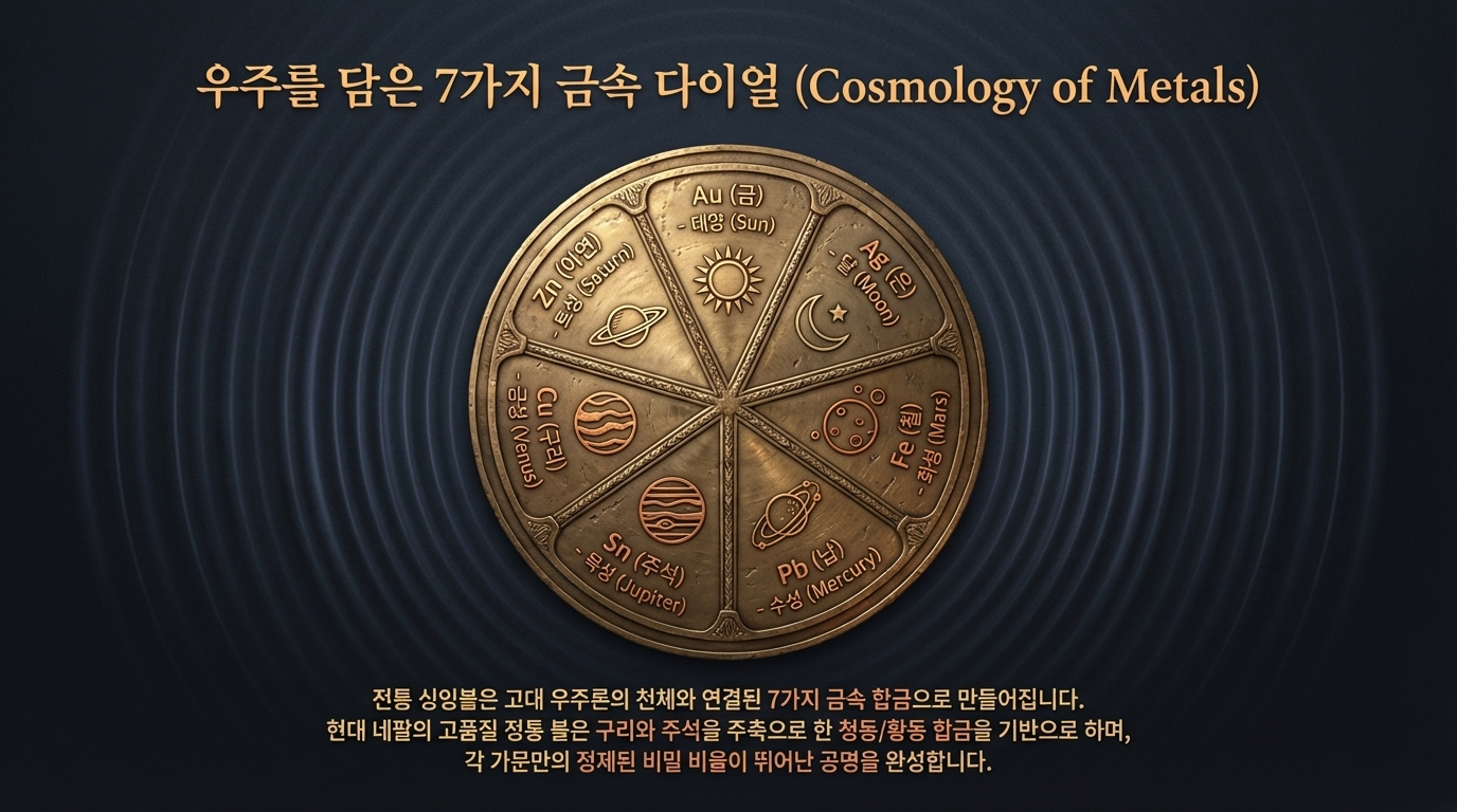 티베트 싱잉볼의 재료 구성이 바로 그 독특하고 겹겹이 쌓인 소리를 만들어냅니다. 전통적인 싱잉볼은 7가지 금속의 합금으로 만들어지며, 각 금속은 고대 우주론에서 천체와 연결되어 있습니다.