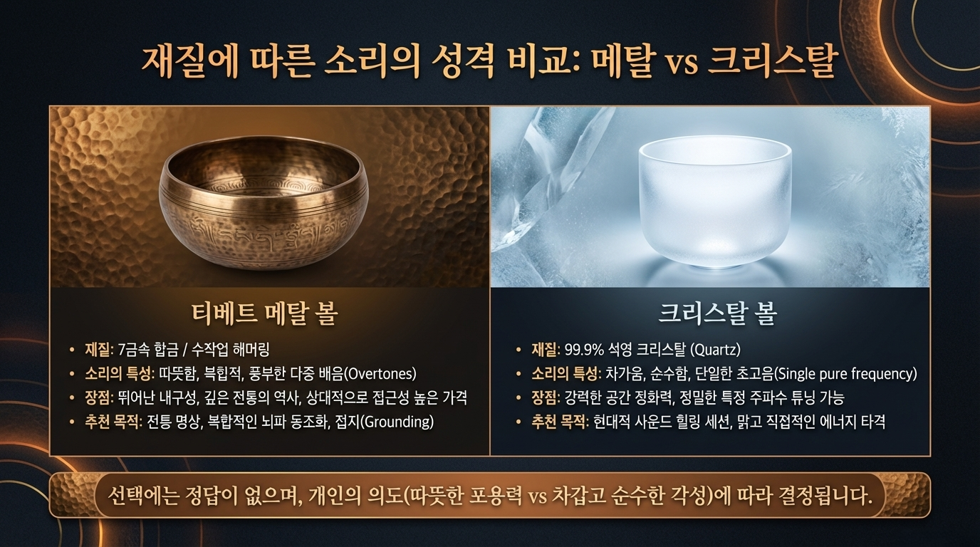 티베트(금속) 싱잉볼은 금속 합금으로 수작업 해머링하여 만들어지며, 풍부한 배음과 함께 따뜻하고 복합적인 다층 음을 만들어냅니다. 크리스탈 싱잉볼은 석영 크리스탈로 만들어지며 단일하고 순수한 고음을 냅니다. 금속 볼은 더 전통적이고, 더 내구성이 있으며, 일반적으로 더 저렴합니다. 크리스탈 볼은 순수하고 맑은 주파수 때문에 일부 현대 사운드 힐링 수행에서 선호됩니다. 선택은 개인적인 의도와 취향에 달려 있습니다.